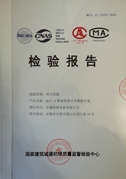 新年的第一個工作日,輕鋼龍骨公司迎來喜訊——公司收到國家建筑城建機械質量監督檢驗中心出具的《檢驗報告》,報告顯示公司生產的QLPJ-A整體附著式升降腳手架符合標準要求,這標志著安徽輕鋼龍骨有限公司具備了生產這種產品的資質。此前,2018年11月23日該產品一次性通過了國家建筑城建機械質量監督檢驗中心專家們的現場驗收。至此歷經了從市場調研、廠家參觀、繪制圖紙、圖紙定稿、生產、安裝的諸多環節,耗時一年零六個月,該產品終于取得了“出生證”。