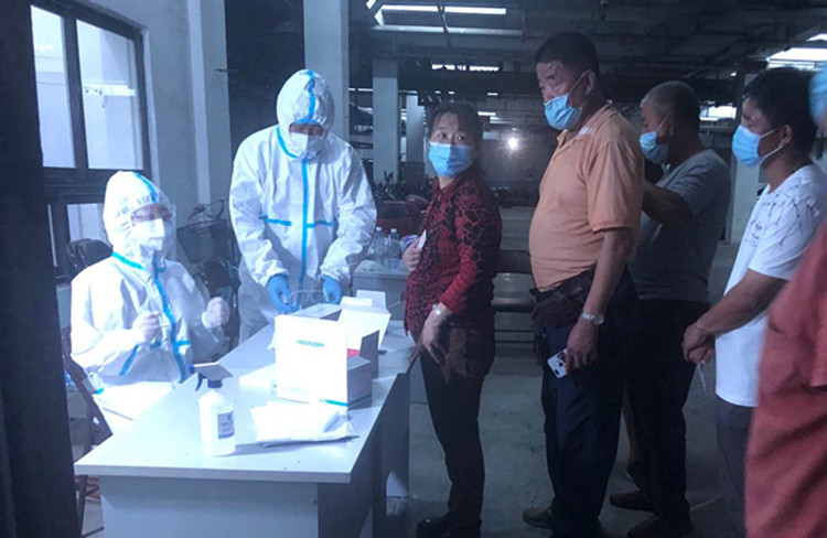 為了確保生產(chǎn)經(jīng)營和防疫工作兩不誤,金連領(lǐng)地項目經(jīng)理主動與街道溝通,確認檢測時間,合理分組安排人員檢測,減少對項目施工的影響。為了避免人員聚集。晚間6點,社區(qū)居民全部檢測完畢以后,項目經(jīng)理將15名管理人員和160名工人分為三組,由管理人員分時段帶領(lǐng)工人前往社區(qū)指定地點進行核酸檢測。為了減輕社區(qū)和防疫工作者的壓力,每隊的小隊長預先對所有工人進行體溫檢測,自我篩查是否有體溫異常的工人,提前指導工人做好信息登記工作,減輕醫(yī)護人員的工作量,加快核算檢測工作進展。