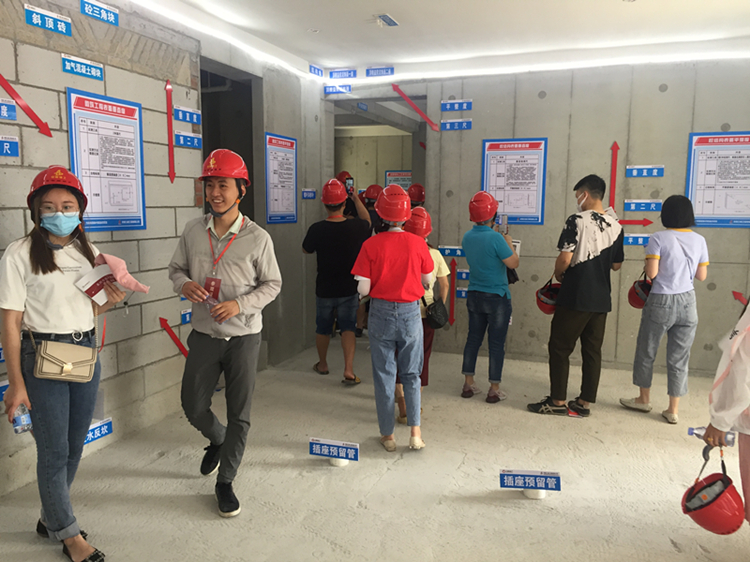 在項目管理人員的引導下,業(yè)主們依次檢測體溫,有序簽到后,首先觀摩了項目VR安全體驗館,感受安徽三建對安全工作的高度重視。隨后,大家一起參觀了樣板間鋁模支撐體系、爬架體系、PC預制梁板、涂料施工、地下室防水、砌筑、衛(wèi)生間、屋面樣板等,項目經(jīng)理詳細介紹了本項目各項工程施工細節(jié)及施工工藝,并對內(nèi)墻涂料,剪力墻薄抹灰,螺桿洞封堵等十余種工藝進行了公開展示。