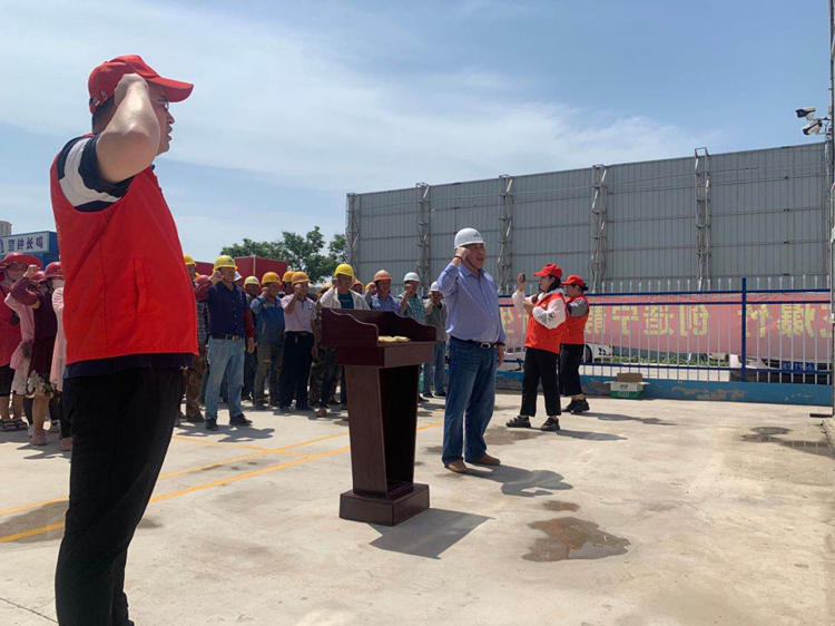 風(fēng)華社區(qū)黨委書記王坤與項(xiàng)目經(jīng)理李先華帶領(lǐng)全體人員宣誓