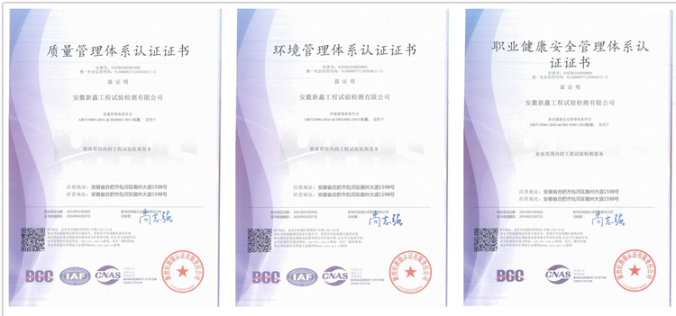 1月8日,安徽新鑫工程試驗檢測有限公司收到了由新世紀檢驗認證有限責任公司發來的質量、環境、職業健康安全三項管理體系認證證書,標志著安徽新鑫工程試驗檢測有限公司質量、環境、職業健康安全體系建設工作邁上新臺階。
