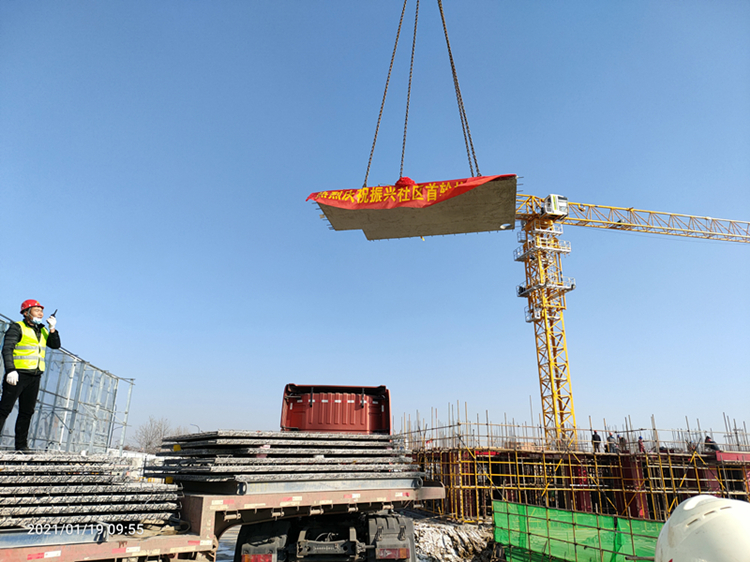 2021年1月18日,隨著一塊3.2米×2米,重達0.99噸的鋼筋混凝土預制構件緩緩吊起,在4#樓一層準確就位,十二公司肥東振興EPC項目PC構件首吊成功,意味著安徽三建十二公司裝配式建筑全面進入實施階段,在產業化建設上又邁出了新的一步。