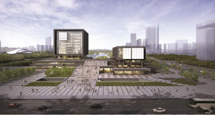 據悉,該項目位于政務區翡翠路與祁門路交口東北角,包括:圖書館主體建筑(含城市展示館、超級書庫等)以及廣場、道路、景觀、車庫等相關附屬設施。其中北側的中心圖書館地上11層,建筑高度63米,南側為文化展示中心地上5層,建筑高度33米。