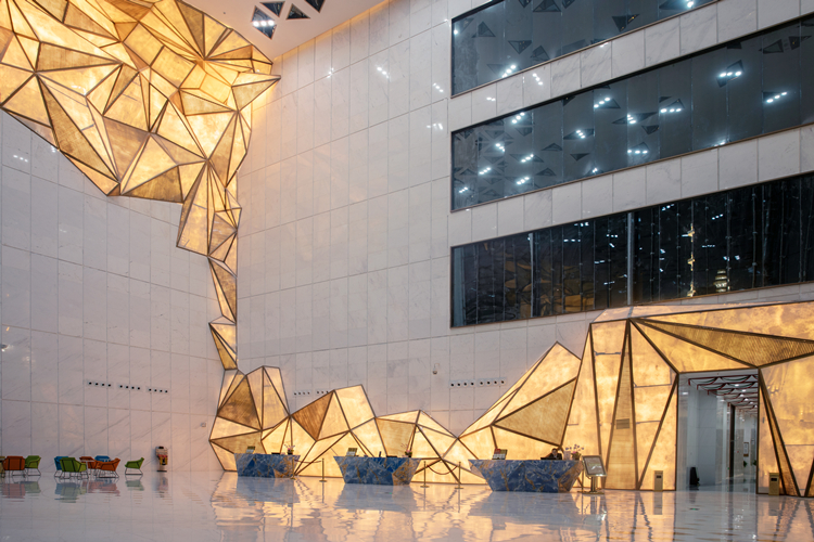 大堂是五星酒店裝飾的焦點(diǎn),也是銅川悅豪工程最困難的地方。為了呈現(xiàn)獨(dú)特的光照效果,大堂大面積采用不規(guī)則、多層次轉(zhuǎn)角透光云石裝飾。云石單塊最大重量超過(guò)200公斤,安裝精度要達(dá)到2毫米,才能確保裝飾效果,而這些都要在24米的空中進(jìn)行安裝,困難重重,業(yè)主方也心里沒(méi)有底。