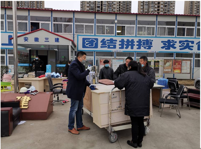 正值大年初一午飯時間,八公司領導立即在分公司工作群及老年護理院項目工作群發(fā)出通知組織搬遷人員。不到1個小時,一支十五名管理人員組成的搬遷突擊隊趕到項目部集結完畢,項目經理高瑞凱擔任隊長。李家保在現(xiàn)場要求管理人員首先要做好個人防護措施,全部佩戴口罩,同時要求項目要做好溝通工作,把必要的生活設施及部分辦公設施留給醫(yī)護人員使用,堅決支持市二院做好疫情防治工作。突擊隊成員頂著雨雪,冒著嚴寒,將資料、物品裝箱、編號,重要資料指定專人負責搬運并跟蹤碼放地點。經過三天的緊張整理和搬遷,1月28日晚順利完成兩棟兩層活動房辦公物資、臨時庫房等物資搬遷,并在市二院指定新辦公地點整理完畢,辦公區(qū)順利移交。