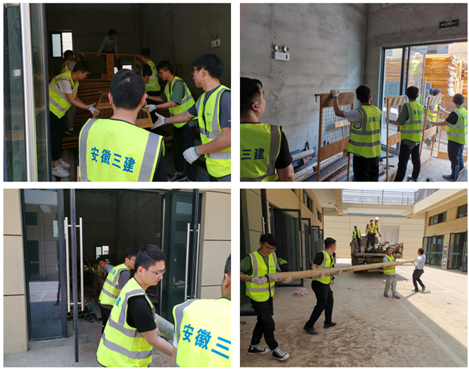 五一期間,蕪湖分公司組織機關及各項目青年職工支援高速東方御府項目搬運定型化防護材料、泵管及鋼筋防護棚立柱。