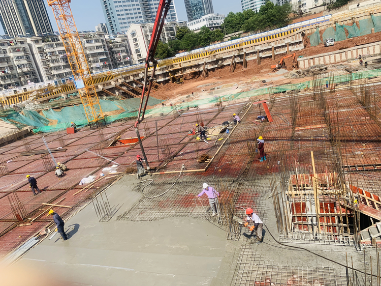 “五一”假期期間,一公司五省八地各項目搶抓黃金施工期,加大機械、人員投入力度,在保證工程質量的前提下,加快施工進度。圖為一公司北海吾悅廣場項目五一期間澆筑混凝土。