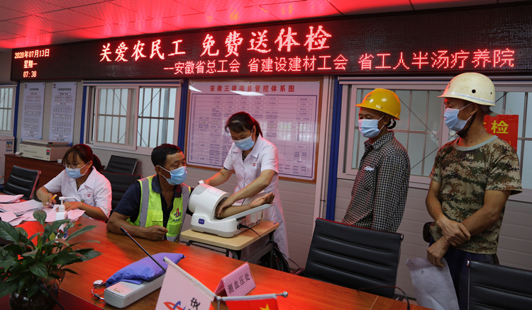 7月13日,由安徽省總工會組織,省建設建材工會、省工人半湯溫泉療養院承辦的“關愛農民工、免費送體檢”活動來到安徽三建合肥市中心圖書館項目,為項目近120名現場農民兄弟工進行了體檢。